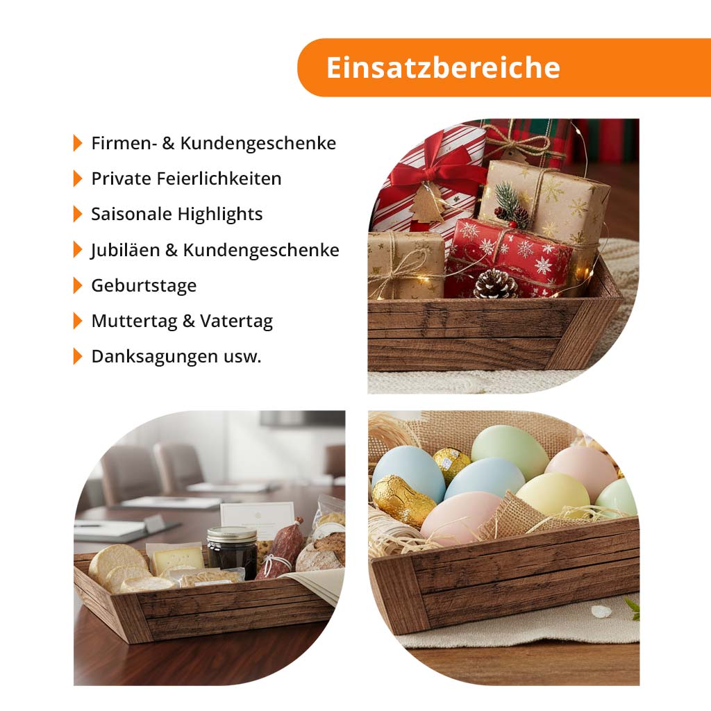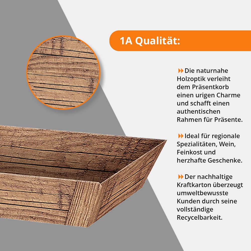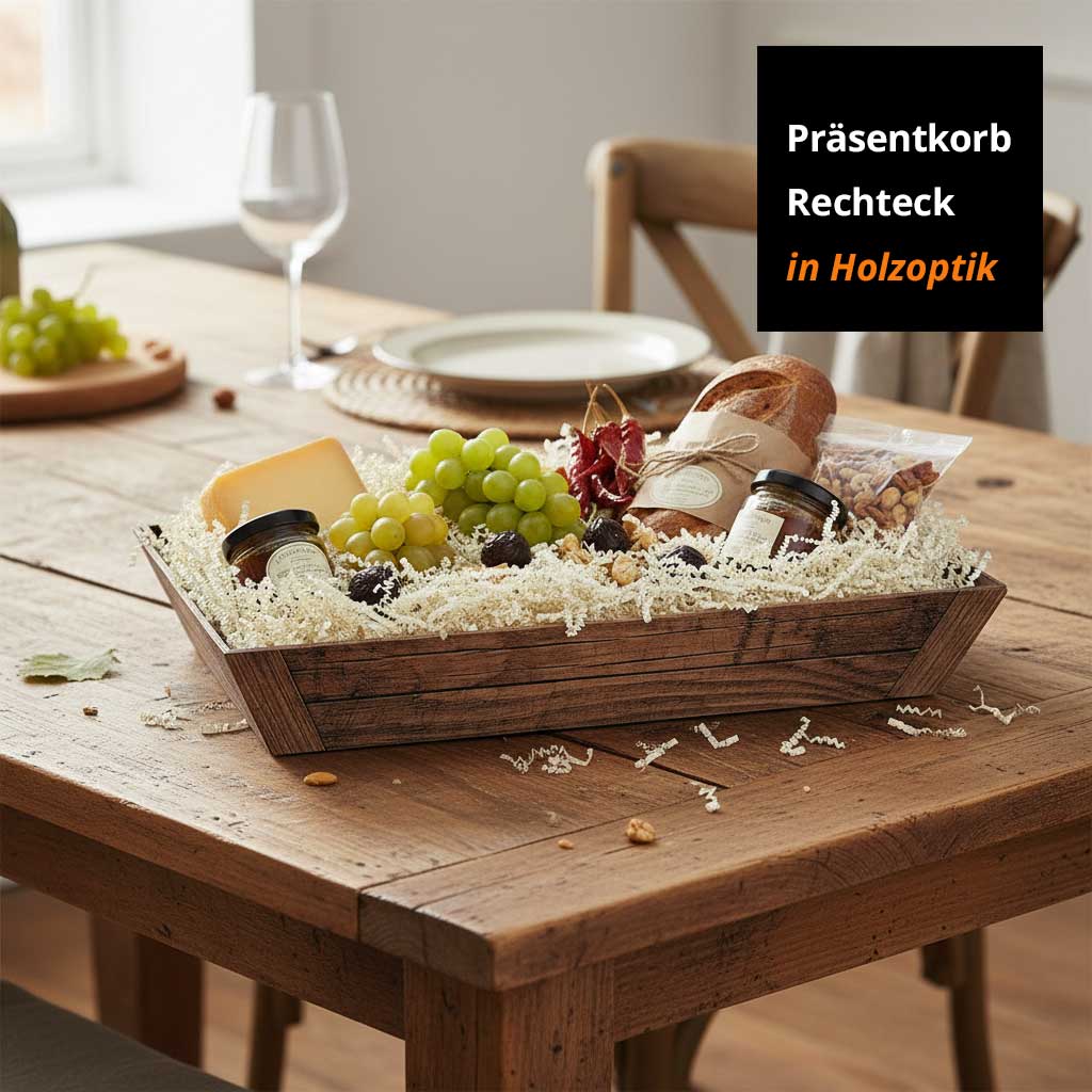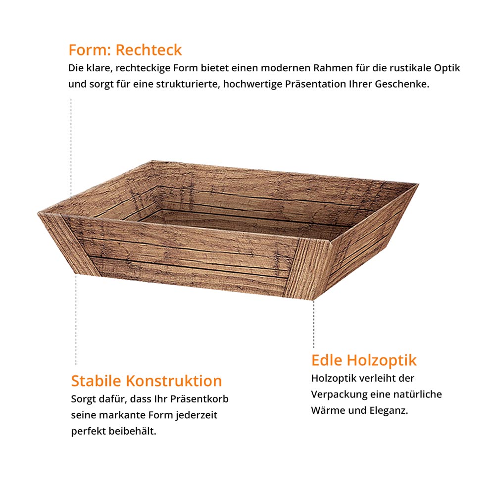 Präsentkorb Geschenkkorb rechteckig, Holzoptik, braun flach