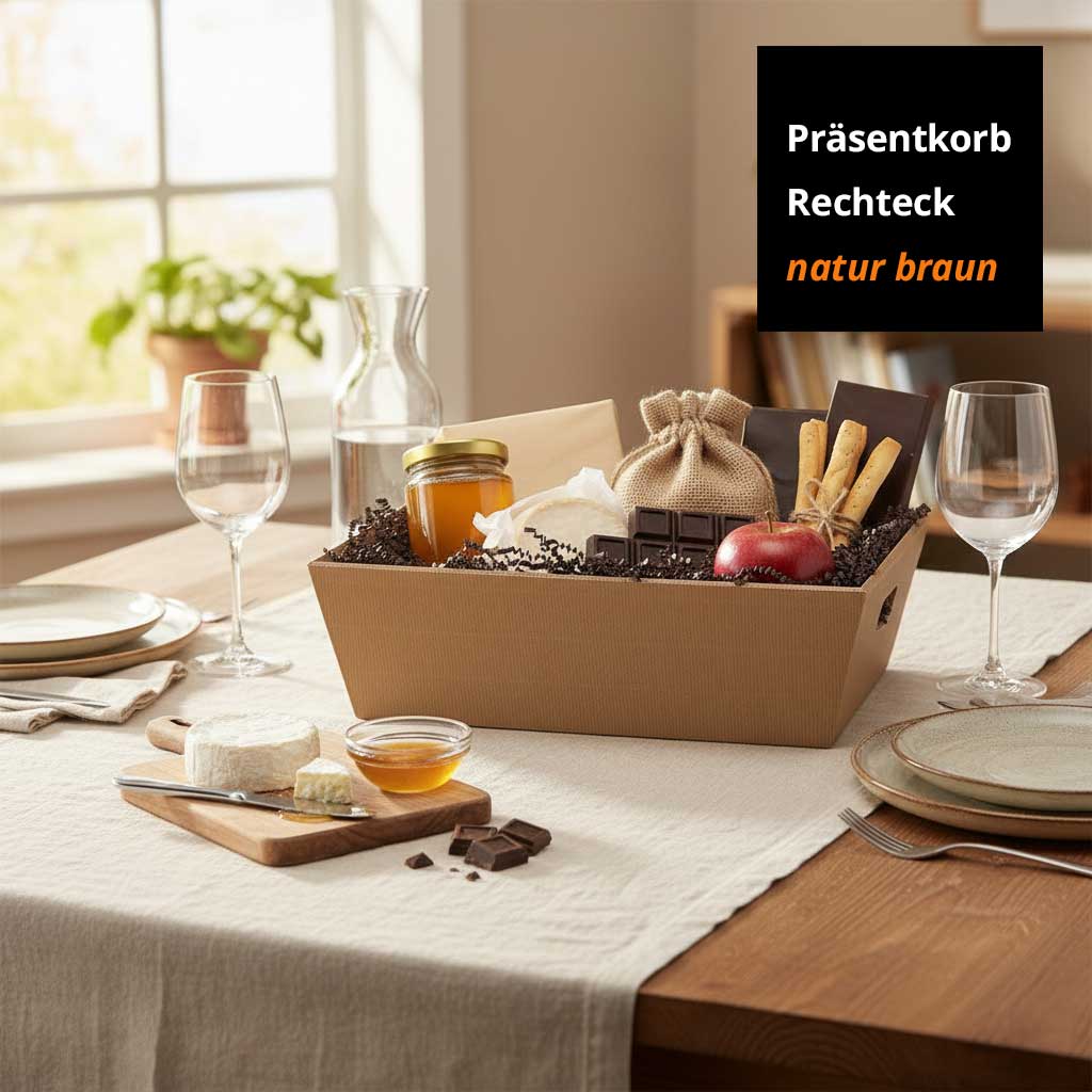 Präsentkorb Geschenkkorb rechteckig, offene Welle, natur braun mit Griffen